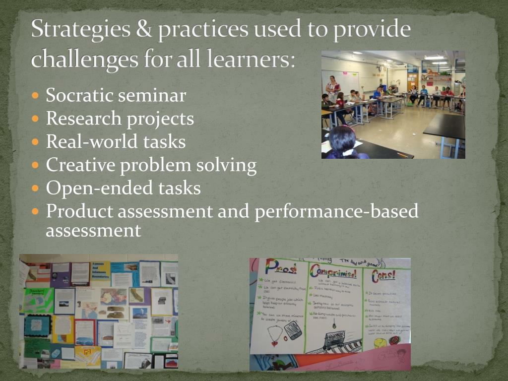 Strategies & practices used to provide challenges for all learners: • Socratic seminar • Research projects • Real-world tasks • Creative problem solving • Open-ended tasks • Product assessment and performance-based assessment