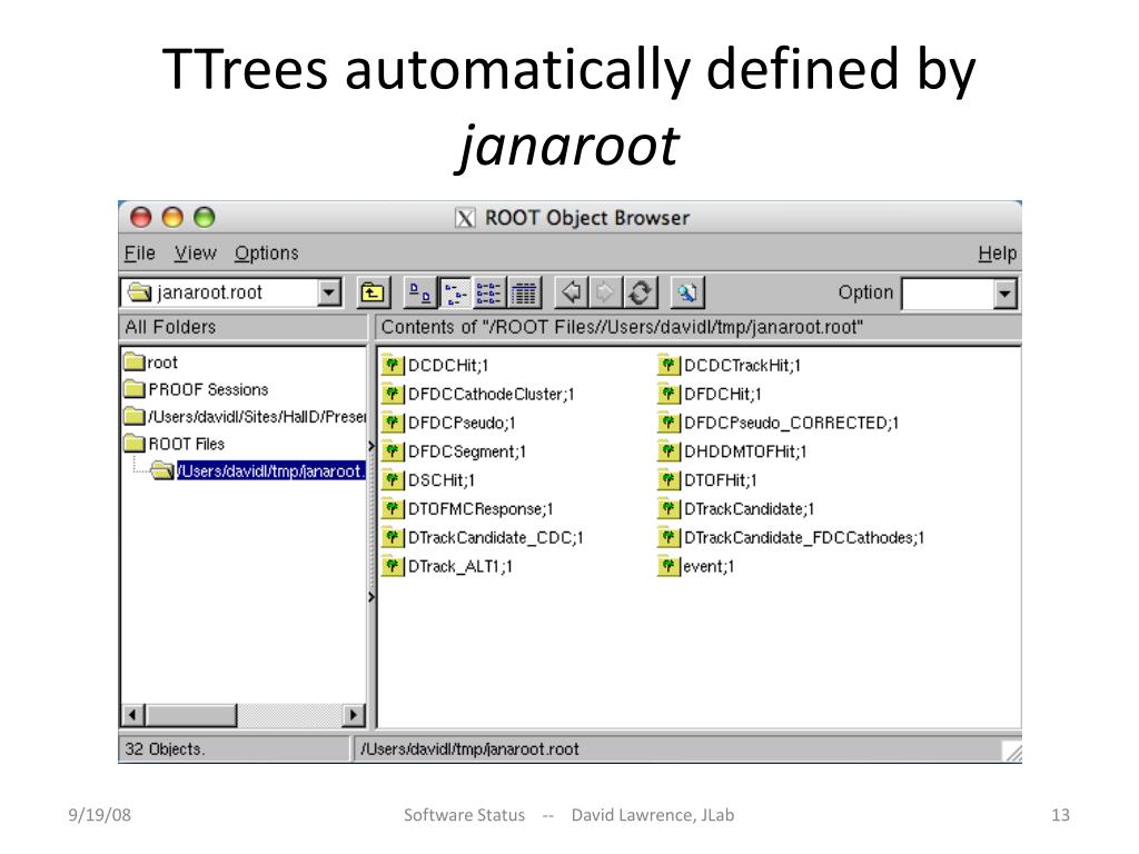 TTrees automatically defined by janaroot Software Status -- David Lawrence, JLab