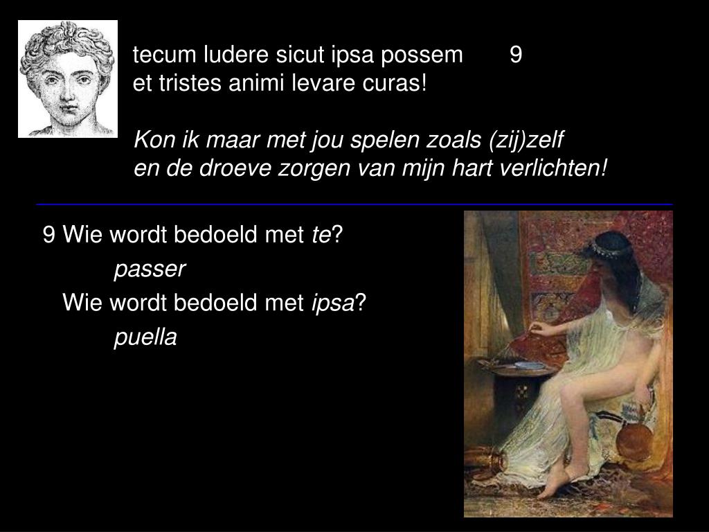 tecum ludere sicut ipsa possem 9et tristes animi levare curas!Kon ik maar met jou spelen zoals (zij)zelfen de droeve zorgen van mijn hart verlichten! • 9 Wie wordt bedoeld met te? • passer • Wiewordt bedoeld met ipsa? • puella
