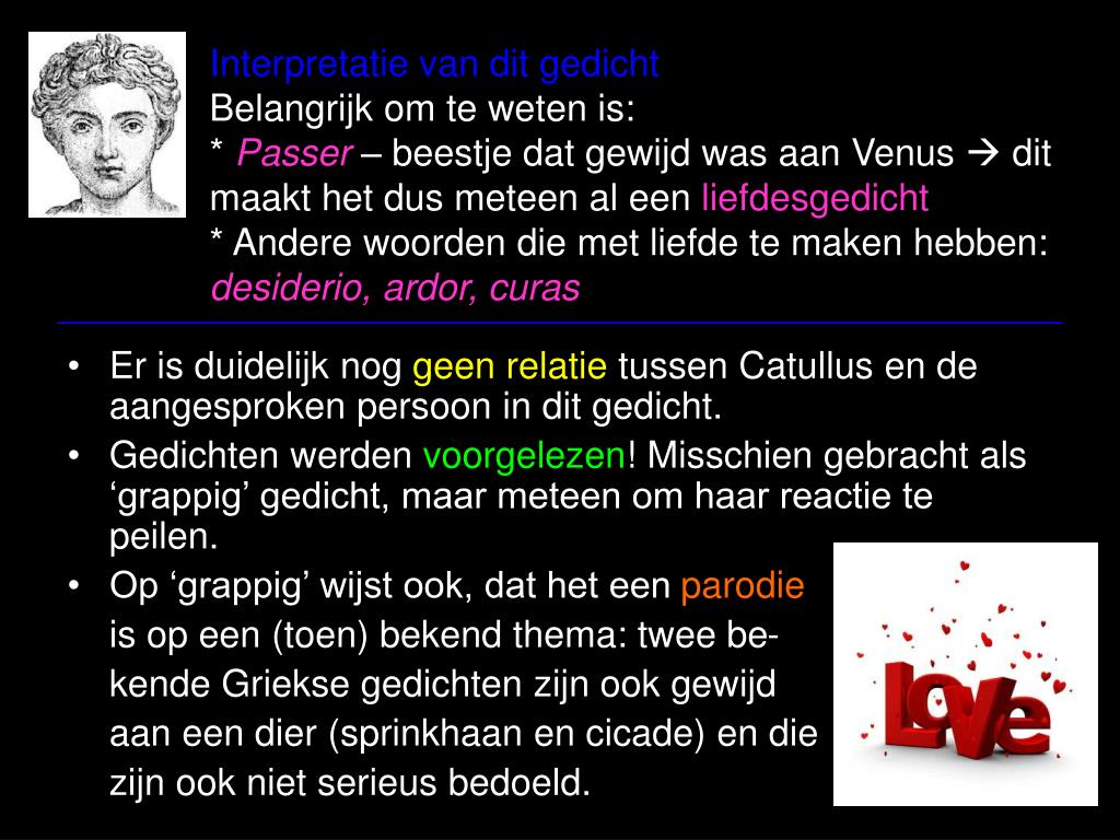 Interpretatie van dit gedichtBelangrijk om te weten is:* Passer – beestje dat gewijd was aan Venus dit maakt het dus meteen al een liefdesgedicht* Andere woorden die met liefde te maken hebben:desiderio, ardor, curas • Er is duidelijk nog geen relatie tussen Catullus en de aangesproken persoon in dit gedicht. • Gedichten werden voorgelezen! Misschien gebracht als ‘grappig’ gedicht, maar meteen om haar reactie te peilen. • Op ‘grappig’ wijst ook, dat het een parodie • is op een (toen) bekend thema: twee be- • kende Griekse gedichten zijn ook gewijd • aan een dier (sprinkhaan en cicade) en die • zijn ook niet serieus bedoeld.