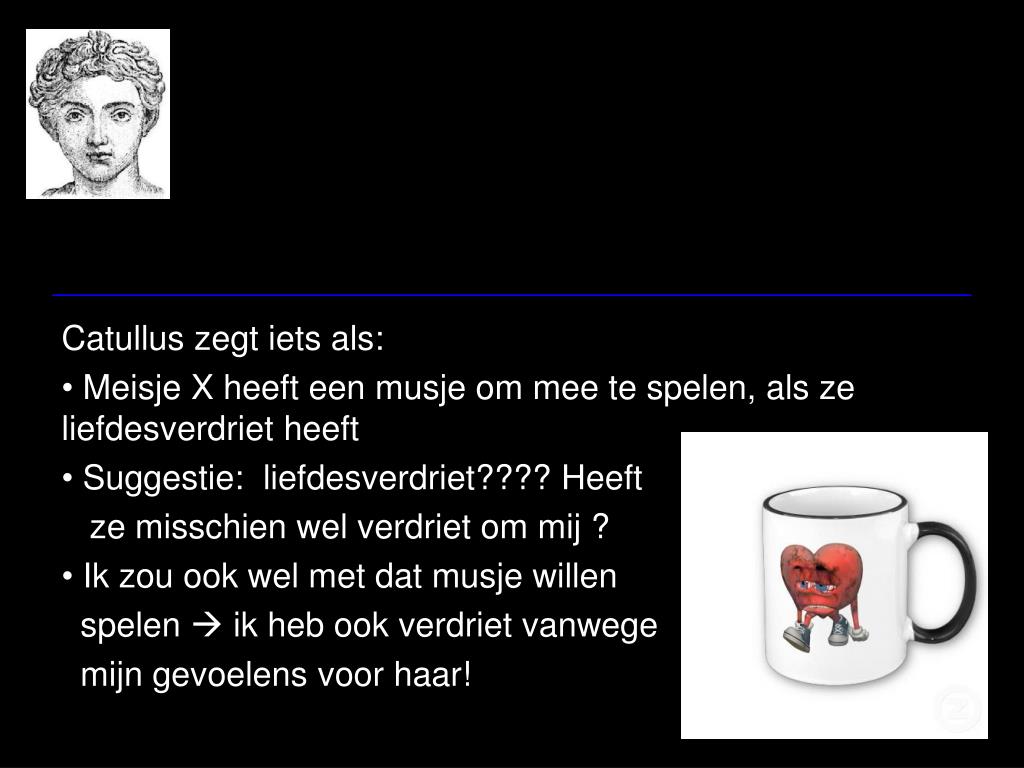 Catullus zegt iets als: • Meisje X heeft een musje om mee te spelen, als ze liefdesverdriet heeft • Suggestie: liefdesverdriet???? Heeft • ze misschien wel verdriet om mij ? • Ik zou ook wel met dat musje willen • spelen ik heb ook verdriet vanwege • mijn gevoelens voor haar!