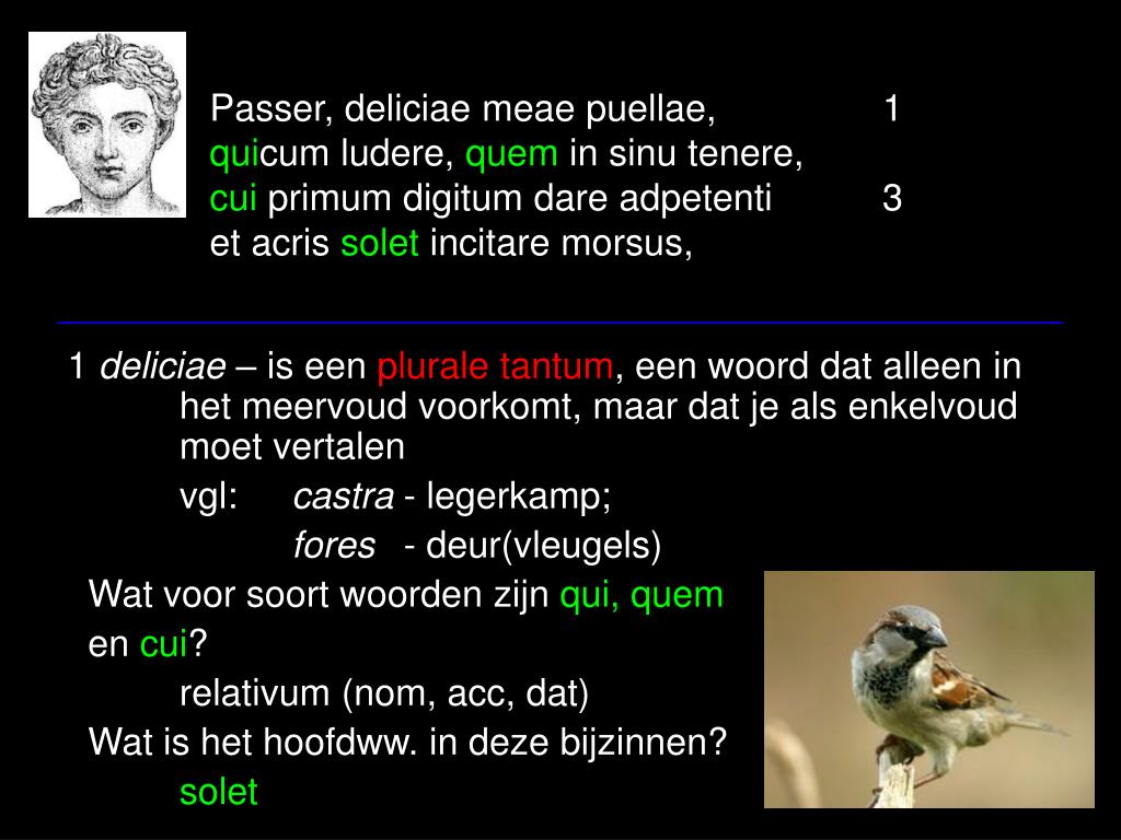 Passer, deliciae meae puellae, 1quicum ludere, quem in sinu tenere,cui primum digitum dare adpetenti 3et acris solet incitare morsus, • 1 deliciae – is een plurale tantum, een woord dat alleen in het meervoud voorkomt, maar dat je als enkelvoud moet vertalen • vgl: castra - legerkamp; • fores - deur(vleugels) • Wat voor soort woorden zijn qui, quem • en cui? • relativum (nom, acc, dat) • Wat is het hoofdww. in deze bijzinnen? • solet