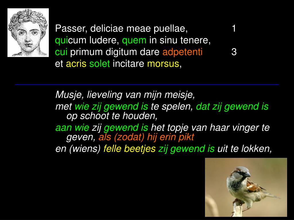 Passer, deliciae meae puellae, 1quicum ludere, quem in sinu tenere,cui primum digitum dare adpetenti 3et acrissolet incitare morsus, • Musje, lieveling van mijn meisje, • met wiezijgewend is te spelen, datzij gewend is op schoot te houden, • aan wie zij gewend is het topje van haar vinger te geven, als (zodat) hij erin pikt • en (wiens) felle beetjeszijgewend is uit te lokken,
