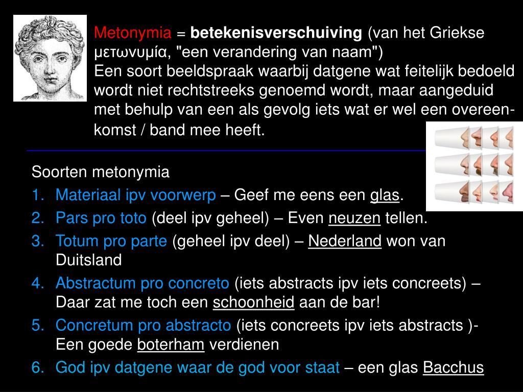 Metonymia = betekenisverschuiving (van het Griekse μετωνυμία, "een verandering van naam") Een soort beeldspraak waarbij datgene wat feitelijk bedoeld wordt niet rechtstreeks genoemd wordt, maar aangeduid met behulp van een als gevolg iets wat er wel een overeen-komst / band mee heeft. Soorten metonymia Materiaal ipv voorwerp – Geef me eens een glas. Pars pro toto (deel ipv geheel) – Even neuzen tellen. Totum pro parte (geheel ipv deel) – Nederland won van Duitsland Abstractum pro concreto (iets abstracts ipv iets concreets) – Daar zat me toch een schoonheid aan de bar! Concretum pro abstracto (iets concreets ipv iets abstracts )- Een goede boterham verdienen God ipv datgene waar de god voor staat – een glas Bacchus