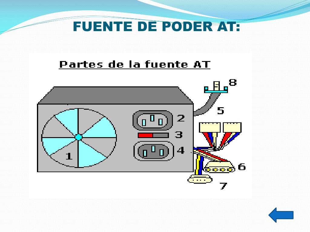 1.- Ventilador: expulsa el aire caliente del interior de la fuente y del gabinete, para mantener frescos los circuitos.2.- Conector de alimentación: recibe el cable de corriente desde el enchufe de pared.3.- Selector de voltaje: permite seleccionar el voltaje de 127V o 240V.4.- Conector de suministro a otros dispositivos: permite alimentar cierto tipo de monitores CRT.5.- Conector AT: alimenta de electricidad a la tarjeta principal.6.- Conector de 4 terminales MOLEX: utilizado para alimentar los discos duros y las unidades ópticas.7.- Conector de 4 terminales para BERG: alimenta las disqueteras.8.- Interruptor manual: permite encender la fuente de manera mecánica.LA FUENTE AT ES UN DISPOSITIVO QUE SE MONTA EN EL GABINETE DE LA COMPUTADORA Y QUE SE ENCARGA BÁSICAMENTE DE TRANSFORMAR LA CORRIENTE ALTERNA DE LA LÍNEA ELÉCTRICA DEL ENCHUFE DOMÉSTICO EN CORRIENTE DIRECTA; LA CUÁL ES UTILIZADA POR LOS ELEMENTOS ELECTRÓNICOS Y ELÉCTRICOS DE LA COMPUTADORA. OTRAS FUNCIONES SON LAS DE SUMINISTRAR LA CANTIDAD DE CORRIENTE Y VOLTAJE QUE LOS DISPOSITIVOS REQUIEREN ASÍ COMO PROTEGERLOS DE PROBLEMAS EN EL SUMINISTRO ELÉCTRICO COMO SUBIDAS DE VOLTAJE. SE LE PUEDE LLAMAR FUENTE DE PODER AT, FUENTE DE ALIMENTACIÓN AT, FUENTE ANALÓGICA, FUENTE DE ENCENDIDO MECÁNICO, ENTRE OTROS NOMBRES.