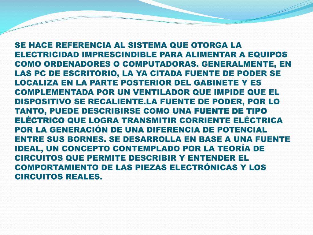 SE HACE REFERENCIA AL SISTEMA QUE OTORGA LA ELECTRICIDAD IMPRESCINDIBLE PARA ALIMENTAR A EQUIPOS COMO ORDENADORES O COMPUTADORAS. GENERALMENTE, EN LAS PC DE ESCRITORIO, LA YA CITADA FUENTE DE PODER SE LOCALIZA EN LA PARTE POSTERIOR DEL GABINETE Y ES COMPLEMENTADA POR UN VENTILADOR QUE IMPIDE QUE EL DISPOSITIVO SE RECALIENTE.LA FUENTE DE PODER, POR LO TANTO, PUEDE DESCRIBIRSE COMO UNA FUENTE DE TIPO ELÉCTRICO QUE LOGRA TRANSMITIR CORRIENTE ELÉCTRICA POR LA GENERACIÓN DE UNA DIFERENCIA DE POTENCIAL ENTRE SUS BORNES. SE DESARROLLA EN BASE A UNA FUENTE IDEAL, UN CONCEPTO CONTEMPLADO POR LA TEORÍA DE CIRCUITOS QUE PERMITE DESCRIBIR Y ENTENDER EL COMPORTAMIENTO DE LAS PIEZAS ELECTRÓNICAS Y LOS CIRCUITOS REALES.