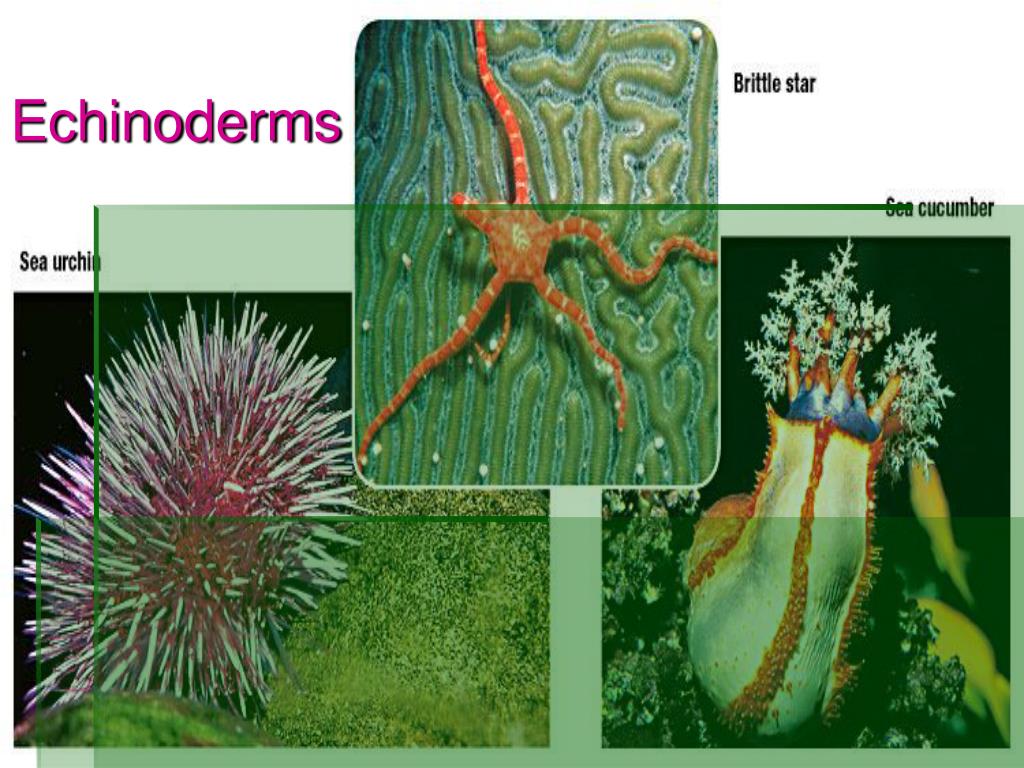 2-3: Echinoderms * Echinoderms are __________, ________, __________, ________, ____________, and _____________. starfish sea lilies feather stars sea urchins sea cucumbers sand dollars * Echinoderm means _______________. All echinoderms have spiny skin. spiny skin