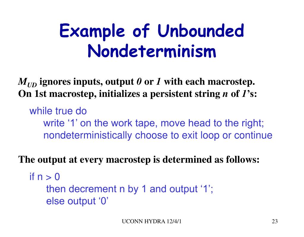 Example of Unbounded Nondeterminism MUD ignores inputs, output 0 or 1 with each macrostep. On 1st macrostep, initializes a persistent string n of 1’s: while true do write ‘1’ on the work tape, move head to the right; nondeterministically choose to exit loop or continue The output at every macrostep is determined as follows: if n > 0 then decrement n by 1 and output ‘1’; else output ‘0’ UCONN HYDRA 12/4/1