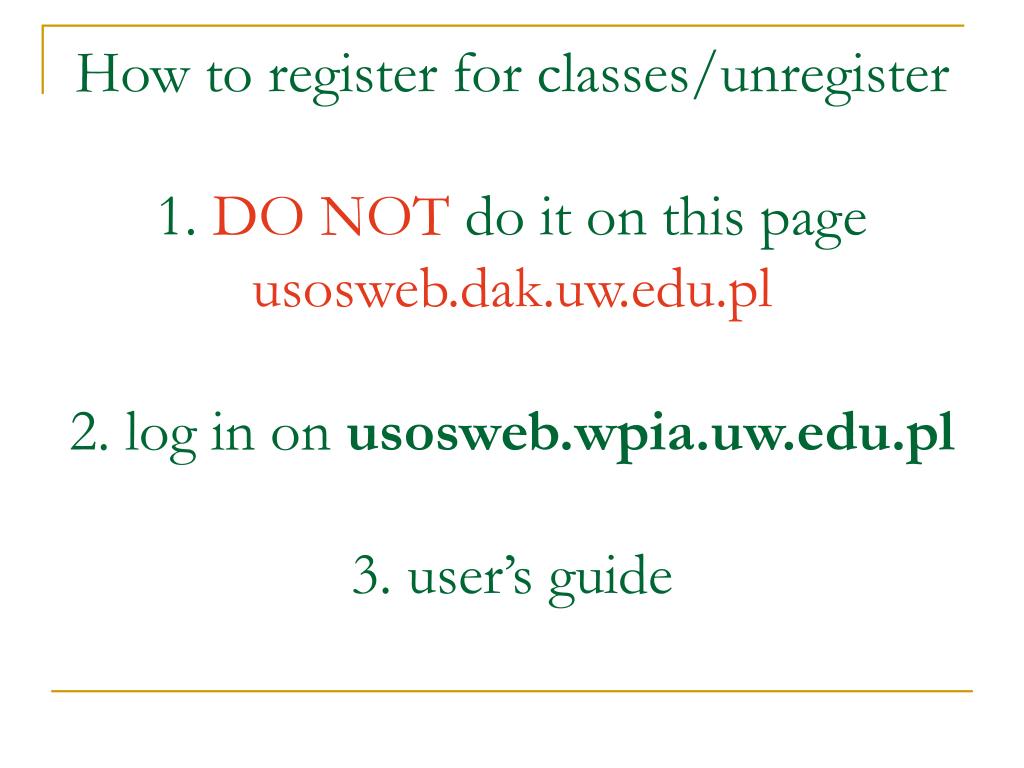 How to register for classes/unregister1. DO NOT do it on this pageusosweb.dak.uw.edu.pl2. log in on usosweb.wpia.uw.edu.pl3.user’s guide