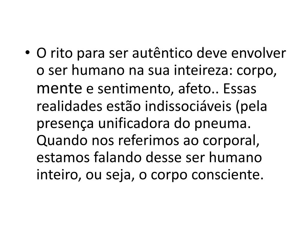 O rito para ser autêntico deve envolver o ser humano na sua inteireza: corpo, mente e sentimento, afeto.. Essas realidades estão indissociáveis (pela presença unificadora do pneuma. Quando nos referimos ao corporal, estamos falando desse ser humano inteiro, ou seja, o corpo consciente.