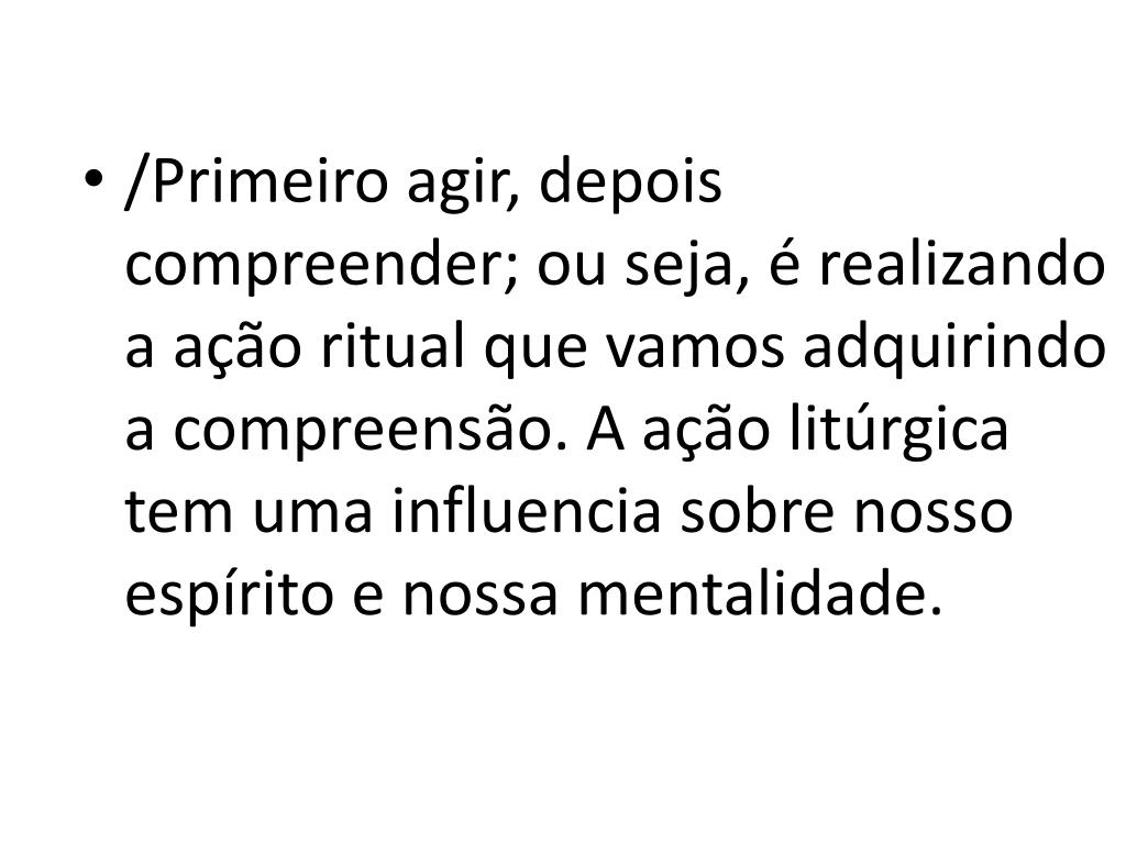 /Primeiro agir, depois compreender; ou seja, é realizando a ação ritual que vamos adquirindo a compreensão. A ação litúrgica tem uma influencia sobre nosso espírito e nossa mentalidade.