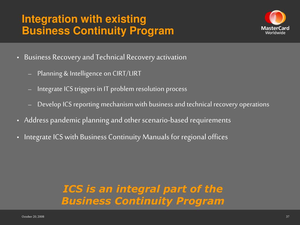 Integration with existing Business Continuity Program • Business Recovery and Technical Recovery activation • Planning & Intelligence on CIRT/LIRT • Integrate ICS triggers in IT problem resolution process • Develop ICS reporting mechanism with business and technical recovery operations • Address pandemic planning and other scenario-based requirements • Integrate ICS with Business Continuity Manuals for regional offices ICS is an integral part of the Business Continuity Program