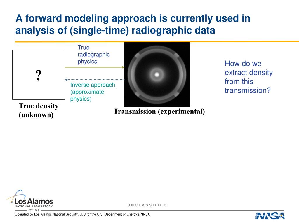 A forward modeling approach is currently used in analysis of (single-time) radiographic data True radiographic physics ? How do we extract density from this transmission? Inverse approach (approximate physics) True density (unknown) Transmission (experimental)