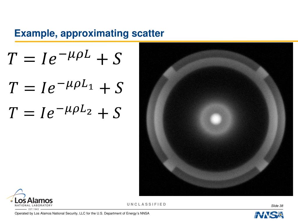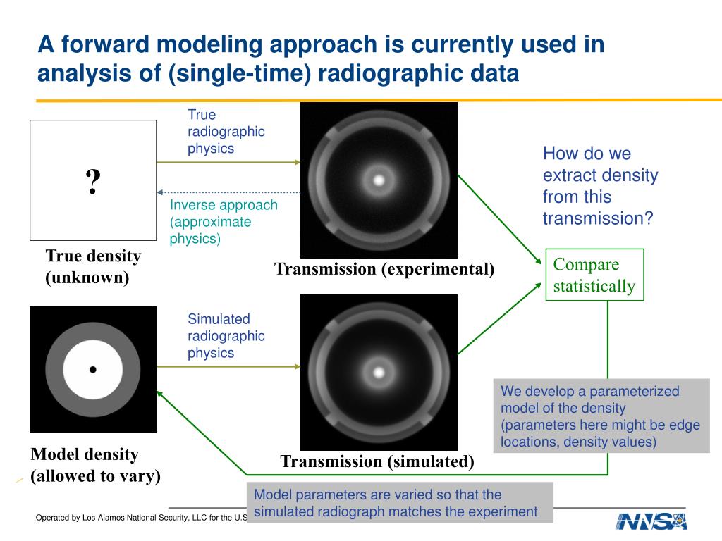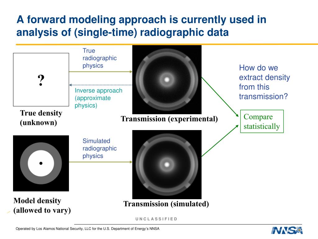 A forward modeling approach is currently used in analysis of (single-time) radiographic data True radiographic physics ? How do we extract density from this transmission? Inverse approach (approximate physics) True density (unknown) Compare statistically Transmission (experimental) Simulated radiographic physics Model density (allowed to vary) Transmission (simulated)