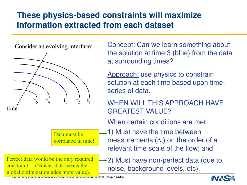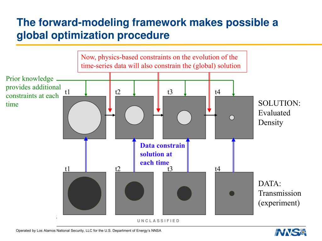 The forward-modeling framework makes possible a global optimization procedure Now, physics-based constraints on the evolution of the time-series data will also constrain the (global) solution Prior knowledge provides additional constraints at each time t1 t2 t3 t4 SOLUTION:Evaluated Density DATA: Transmission (experiment) Data constrain solution at each time t1 t2 t3 t4