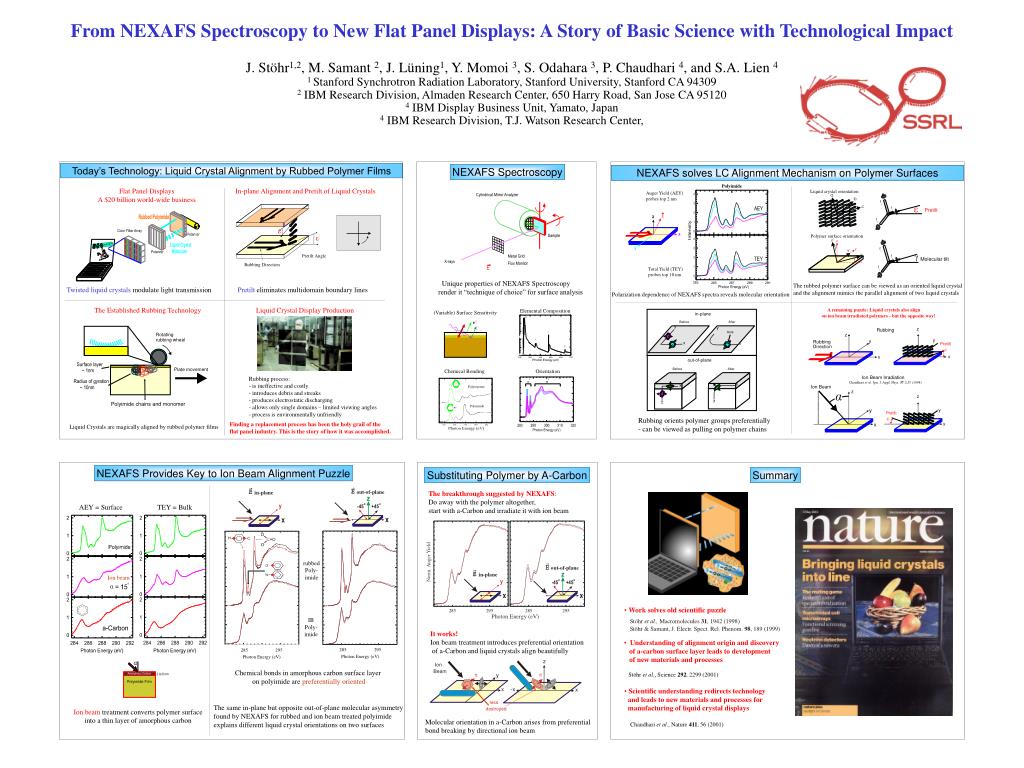 in-plane out-of-plane Cylindrical Mirror Analyzer in-plane o o -45 +45 Before After y y more x x A remaining puzzle: Liquid crystals also align on ion beam irradiated polymers - but the opposite way! Sample b f e out-of-plane a c f Pretilt z AEY = Surface Rubbing c Metal Grid Before After z X-rays Flux Monitor y f y E Rubbing 2 to 6 nm Pretilt b x Direction x e x x z e z z’ z C C C C C e O g C N f y Ion Beam Irradiation TEY = Bulk y’ z ’ g Chaudhari et al. Jpn. J. Appl. Phys. 37, L55 (1998) x’ f Polystyrene Ion Beam Molecular tilt g C x ’ out-of-plane z Pretilt Angle in-plane x rubbed Poly- imide z f Rubbing Direction y ’ Polyimide O N C o o -45 +45 y y Pretilt N e F x x Ion beam 284 286 288 290 292 o NEXAFS solves LC Alignment Mechanism on Polymer Surfaces IB Poly- imide (Variable) Surface Sensitivity Elemental Composition Polyimide - e Auger Yield (AEY) probes top 2 nm Liquid crystal orientation Rotating 285 295 a 285 295 rubbing wheel Photon Energy (eV) Photon Energy (eV) z Ion Beam p p y Surface layer Plate movement ~ 1nm x -x x Orientation Chemical Bonding Polymer surface orientation Radius of gyration less ~ 10nm destroyed Polyimide chains and monomer Total Yield (TEY) probes top 10 nm The rubbed polymer surface can be viewed as an oriented liquid crystal and the alignment mimics the parallel alignment of two liquid crystals Polarization dependence of NEXAFS spectra reveals molecular orientation Rubbing orients polymer groups preferentially - can be viewed as pulling on polymer chains NEXAFS Provides Key to Ion Beam Alignment Puzzle Substituting Polymer by A-Carbon Summary The breakthrough suggested by NEXAFS: Do away with the polymer altogether, start with a-Carbon and irradiate it with ion beam • Work solves old scientific puzzle • Scientific understanding redirects technology • and leads to new materials and processes for • manufacturing of liquid crystal displays • Chaudhari et al., Nature 411, 56 (2001) It works! Ion beam treatment introduces preferential orientation of a-Carbon and liquid crystals align beautifully • Understanding of alignment origin and discovery • of a-carbon surface layer leads to development • of new materials and processes • Stöhr et al., Science 292, 2299 (2001) Chemical bonds in amorphous carbon surface layer on polyimide are preferentially oriented The same in-plane but opposite out-of-plane molecular asymmetry found by NEXAFS for rubbed and ion beam treated polyimide explains different liquid crystal orientations on two surfaces Ion beam treatment converts polymer surface into a thin layer of amorphous carbon Molecular orientation in a-Carbon arises from preferential bond breaking by directional ion beam From NEXAFS Spectroscopy to New Flat Panel Displays: A Story of Basic Science with Technological Impact J. Stöhr1,2, M. Samant 2, J. Lüning1, Y. Momoi 3, S. Odahara 3, P. Chaudhari 4, and S.A. Lien 4 1 Stanford Synchrotron Radiation Laboratory, Stanford University, Stanford CA 94309 2 IBM Research Division, Almaden Research Center, 650 Harry Road, San Jose CA 95120 4 IBM Display Business Unit, Yamato, Japan 4 IBM Research Division, T.J. Watson Research Center, Today’s Technology: Liquid Crystal Alignment by Rubbed Polymer Films NEXAFS Spectroscopy Flat Panel Displays A $20 billion world-wide business In-plane Alignment and Pretilt of Liquid Crystals Unique properties of NEXAFS Spectroscopy render it “technique of choice” for surface analysis Pretilt eliminates multidomain boundary lines Twisted liquid crystalsmodulate light transmission The Established Rubbing Technology Liquid Crystal Display Production • Rubbing process: • is ineffective and costly • introduces debris and streaks • produces electrostatic discharging • allows only single domains – limited viewing angles • process is environmentally unfriendly Finding a replacement process has been the holy grail of the flat panel industry. This is the story of how it was accomplished. Liquid Crystals are magically aligned by rubbed polymer films