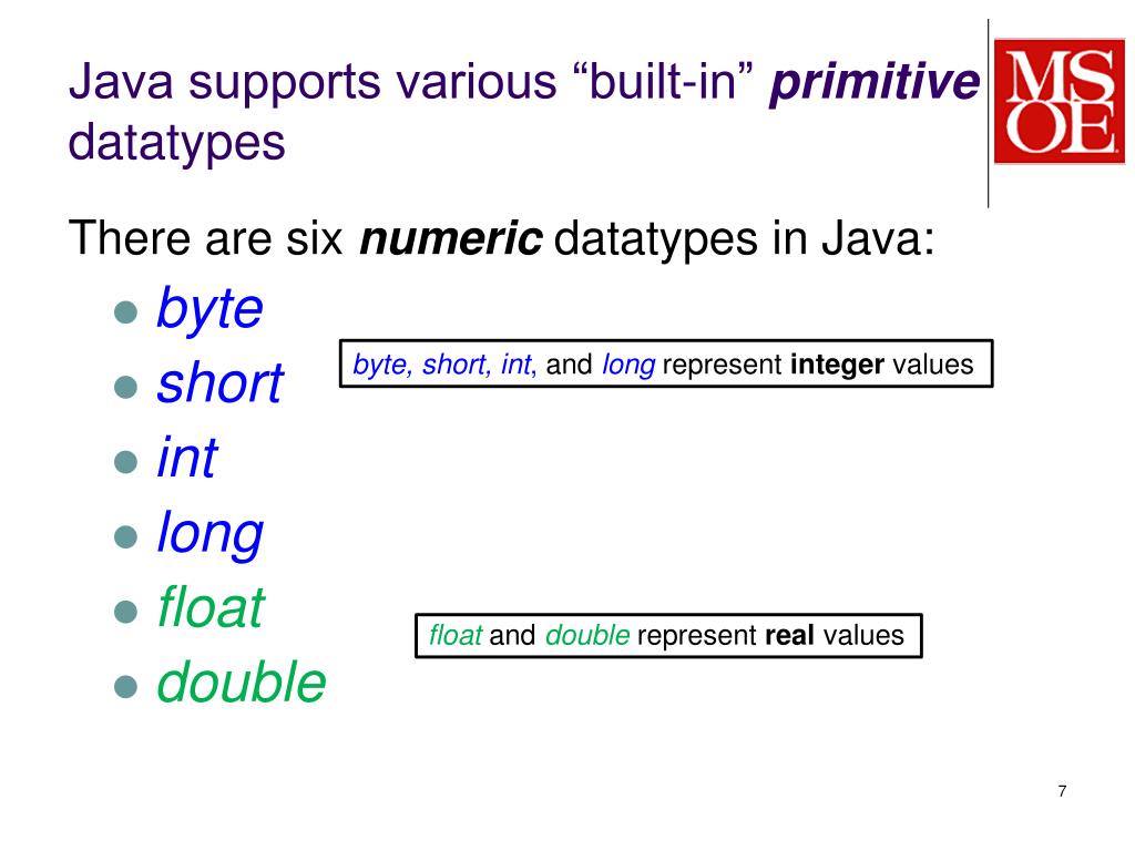 Java supports various “built-in” primitivedatatypes There are six numericdatatypes in Java: • byte • short • int • long • float • double byte, short, int, andlong represent integer values floatanddoublerepresent real values