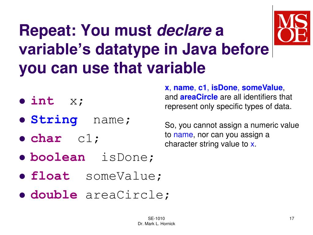 Repeat: You must declare a variable’s datatype in Java before you can use that variable • int x; • Stringname; • char c1; • booleanisDone; • floatsomeValue; • doubleareaCircle; x, name, c1, isDone, someValue, and areaCircleare all identifiers that represent only specific types of data. So, you cannot assign a numeric value to name, nor can you assign a character string value to x. SE-1010Dr. Mark L. Hornick