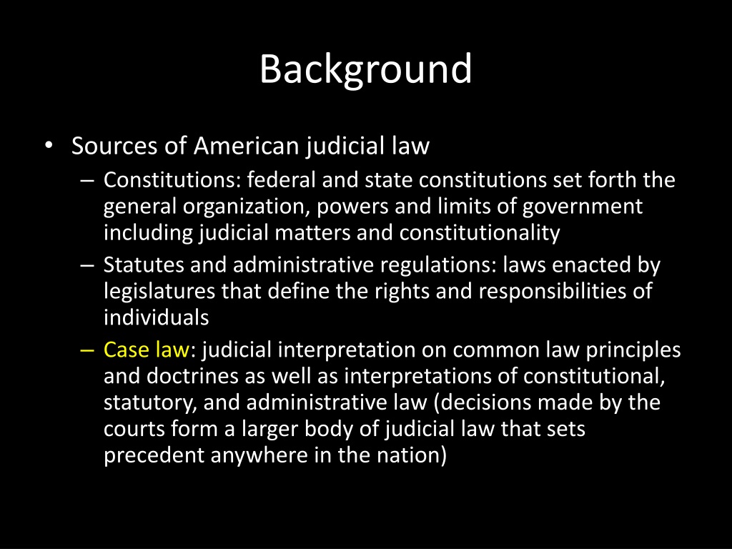 Background • Sources of American judicial law • Constitutions: federal and state constitutions set forth the general organization, powers and limits of government including judicial matters and constitutionality • Statutes and administrative regulations: laws enacted by legislatures that define the rights and responsibilities of individuals • Case law: judicial interpretation on common law principles and doctrines as well as interpretations of constitutional, statutory, and administrative law (decisions made by the courts form a larger body of judicial law that sets precedent anywhere in the nation)