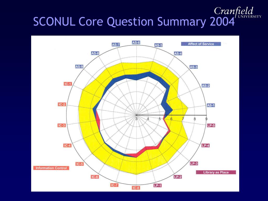 2003 – 5 additional questions for all SCONUL Participants • Access to photocopying and printing facilities • Main text and readings needed • Provision for information skills training • Helpfulness in dealing with users’ IT problems • Availability of subject specialist assistance