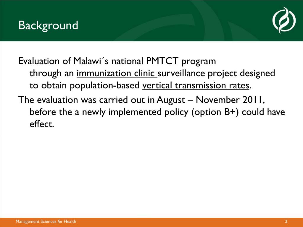 Background • Evaluation of Malawi´s national PMTCT program through an immunization clinic surveillance project designed to obtain population-based vertical transmission rates. • The evaluation was carried out in August – November 2011, before the a newly implemented policy (option B+) could have effect.