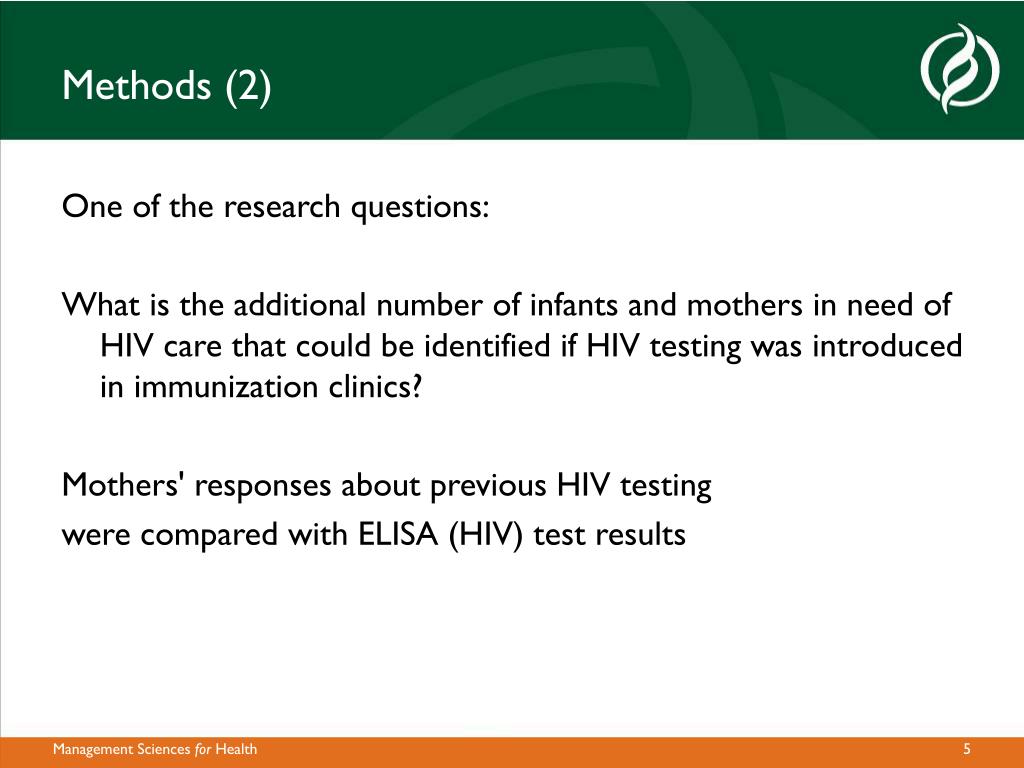 Methods (2) • One of the research questions: • What is the additional number of infants and mothers in need of HIV care that could be identified if HIV testing was introduced in immunization clinics? • Mothers' responses about previous HIV testing • were compared with ELISA (HIV) test results