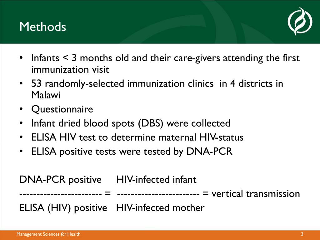 Methods • Infants < 3 months old and their care-givers attending the first immunization visit • 53 randomly-selected immunization clinics in 4 districts in Malawi • Questionnaire • Infant dried blood spots (DBS) were collected • ELISA HIV test to determine maternal HIV-status • ELISA positive tests were tested by DNA-PCR • DNA-PCR positive HIV-infected infant • ------------------------ = ------------------------ = vertical transmission • ELISA (HIV) positive HIV-infected mother