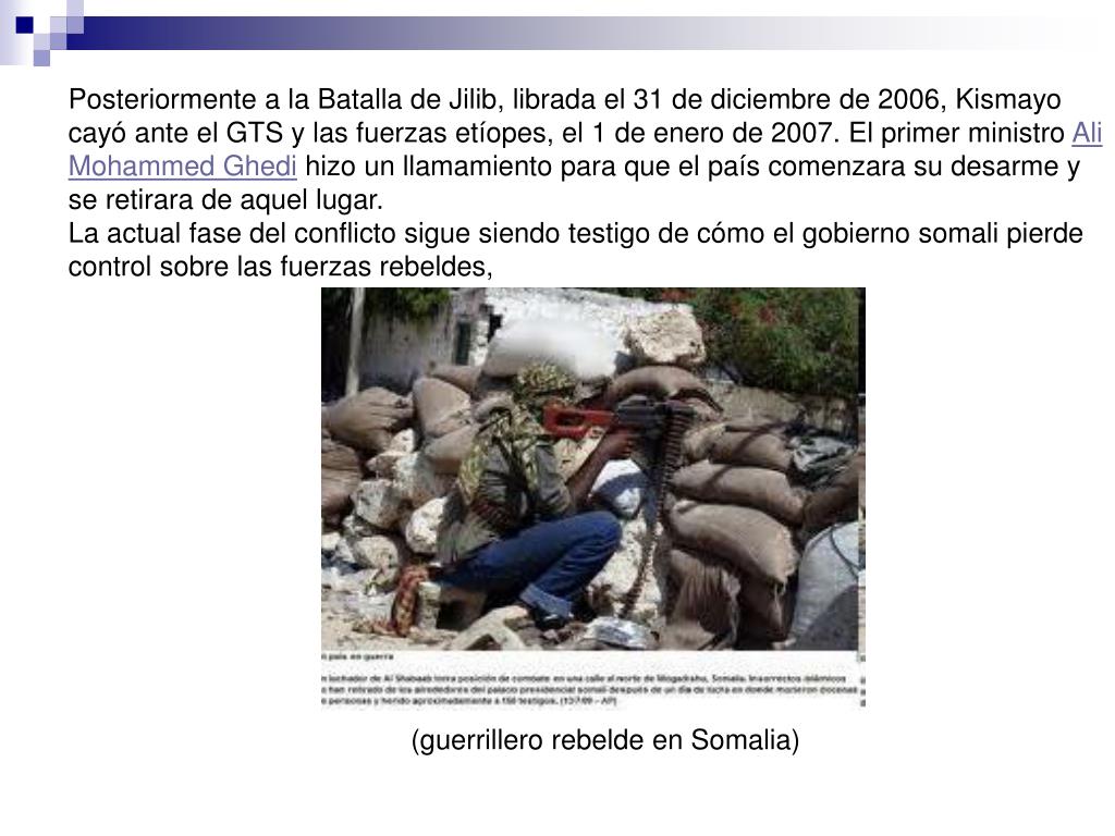 Posteriormente a la Batalla de Jilib, librada el 31 de diciembre de 2006, Kismayo cayó ante el GTS y las fuerzas etíopes, el 1 de enero de 2007. El primer ministro Ali Mohammed Ghedi hizo un llamamiento para que el país comenzara su desarme y se retirara de aquel lugar. La actual fase del conflicto sigue siendo testigo de cómo el gobierno somali pierde control sobre las fuerzas rebeldes, (guerrillero rebelde en Somalia)