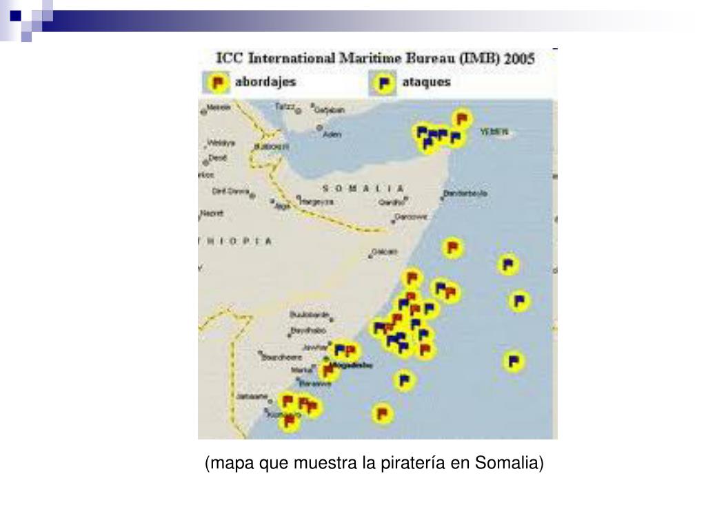 Piratería Así pues la Guerra Civil en Somalia ha traído otra serie de pleitos en el medio oriente tales como la piratería somalí existente en las costas de aquel país que desde un inicio se ha convertido en una grave amenaza para el transporte marítimo internacional, por lo que desde 2005 varias organizaciones incluyendo la la Organización Marítima Internacional y el Programa Mundial de Alimentos, han (piratas somalíes capturados bordo de una nave) expresado su preocupación ante el aumento de este tipo de actos, ya que en los últimos años varias noticias relevantes de aquella zona marítima están muy vinculadas a este conflicto que ha causado gran impacto a nivel mundial.