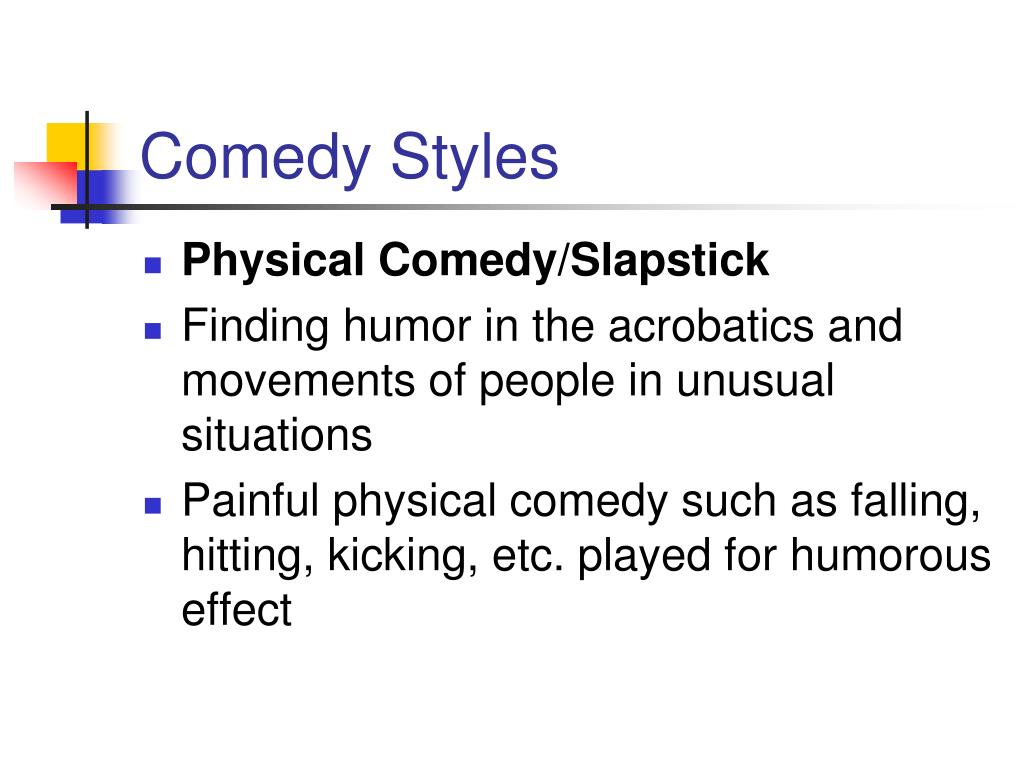Comedy Styles • Physical Comedy/Slapstick • Finding humor in the acrobatics and movements of people in unusual situations • Painful physical comedy such as falling, hitting, kicking, etc. played for humorous effect