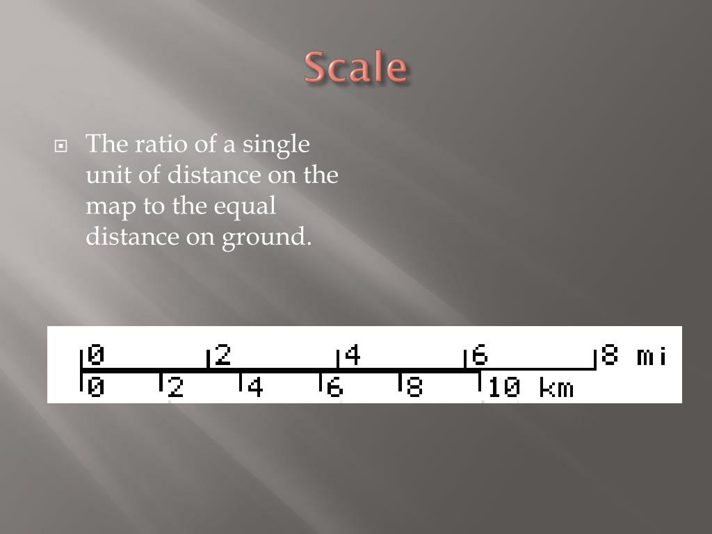 Scale • The ratio of a single unit of distance on the map to the equal distance on ground.
