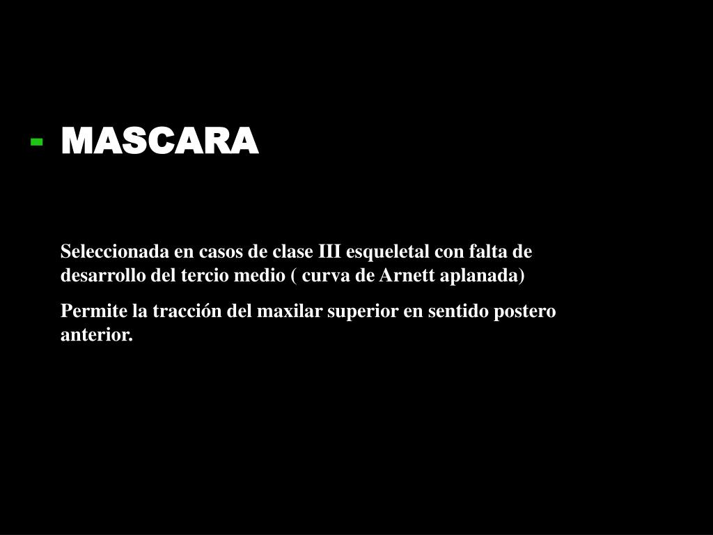 MASCARA Seleccionada en casos de clase III esqueletal con falta de desarrollo del tercio medio ( curva de Arnett aplanada) Permite la tracción del maxilar superior en sentido postero anterior.