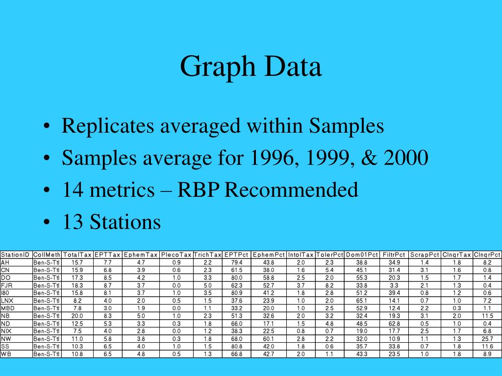 Graph Data • Replicates averaged within Samples • Samples average for 1996, 1999, & 2000 • 14 metrics – RBP Recommended • 13 Stations