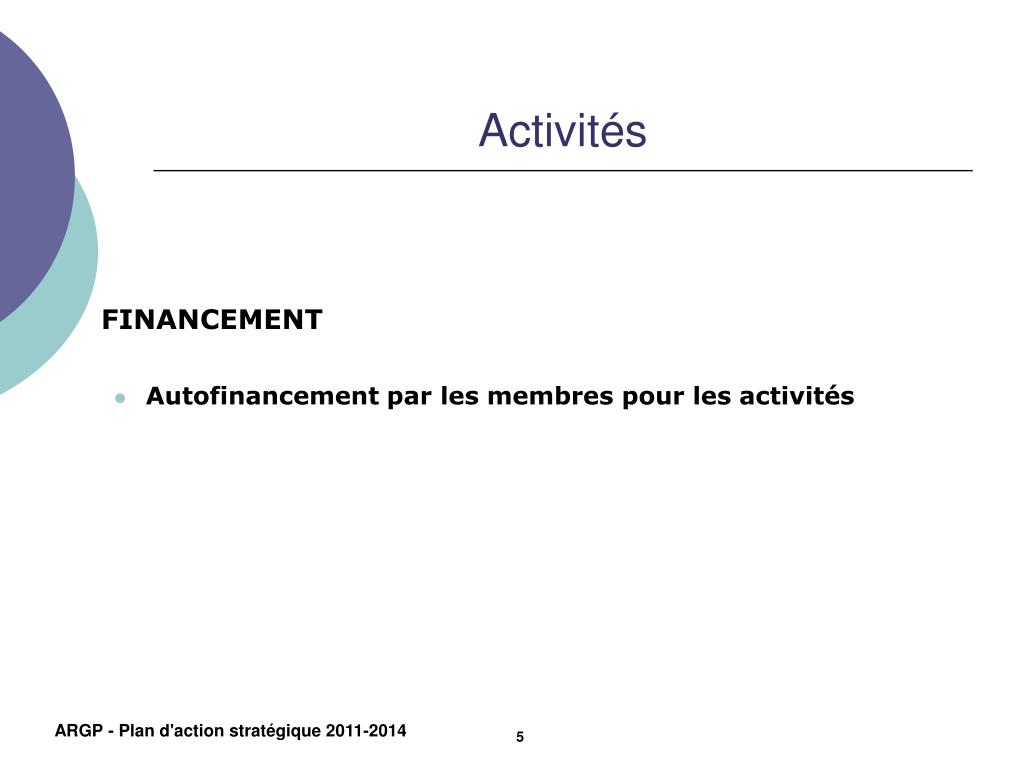 Activités FINANCEMENT • Autofinancement par les membres pour les activités ARGP - Plan d'action stratégique 2011-2014 5