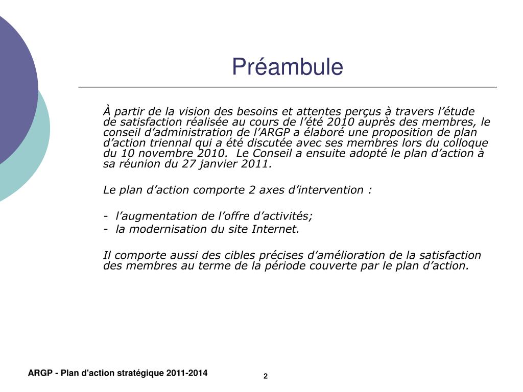 Préambule À partir de la vision des besoins et attentes perçus à travers l’étude de satisfaction réalisée au cours de l’été 2010 auprès des membres, le conseil d’administration de l’ARGP a élaboré une proposition de plan d’action triennal qui a été discutée avec ses membres lors du colloque du 10 novembre 2010. Le Conseil a ensuite adopté le plan d’action à sa réunion du 27 janvier 2011. Le plan d’action comporte 2 axes d’intervention : - l’augmentation de l’offre d’activités; - la modernisation du site Internet. Il comporte aussi des cibles précises d’amélioration de la satisfaction des membres au terme de la période couverte par le plan d’action. ARGP - Plan d'action stratégique 2011-2014 2
