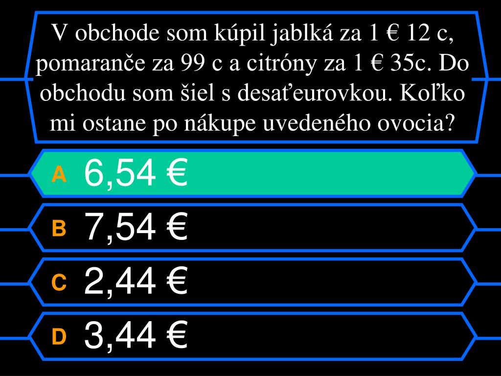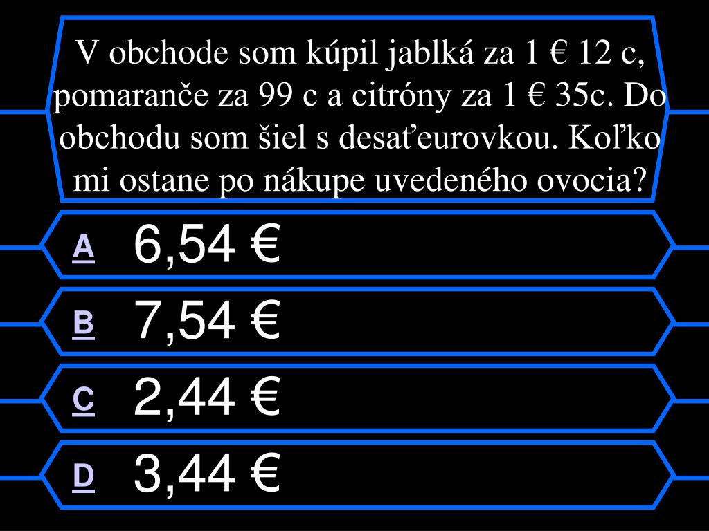 V obchode som kúpil jablká za 1 € 12 c, pomaranče za 99 c a citróny za 1 € 35c. Do obchodu som šiel s desaťeurovkou. Koľko mi ostane po nákupe uvedeného ovocia? A 6,54 € B 7,54 € C 2,44 € D 3,44 €