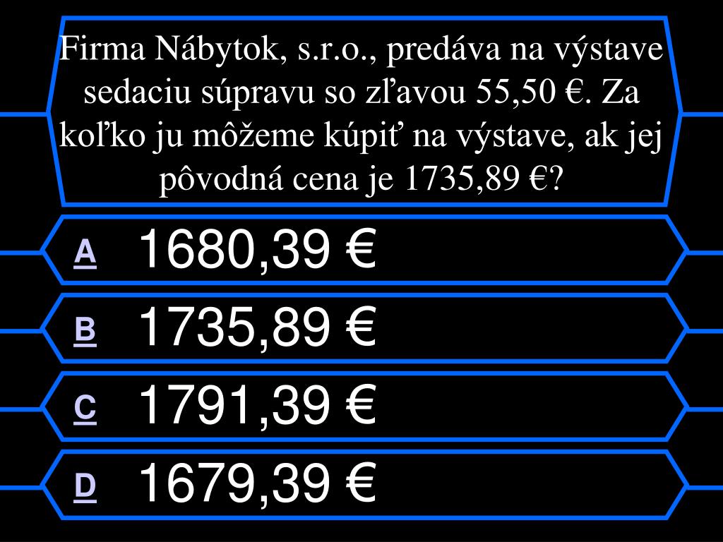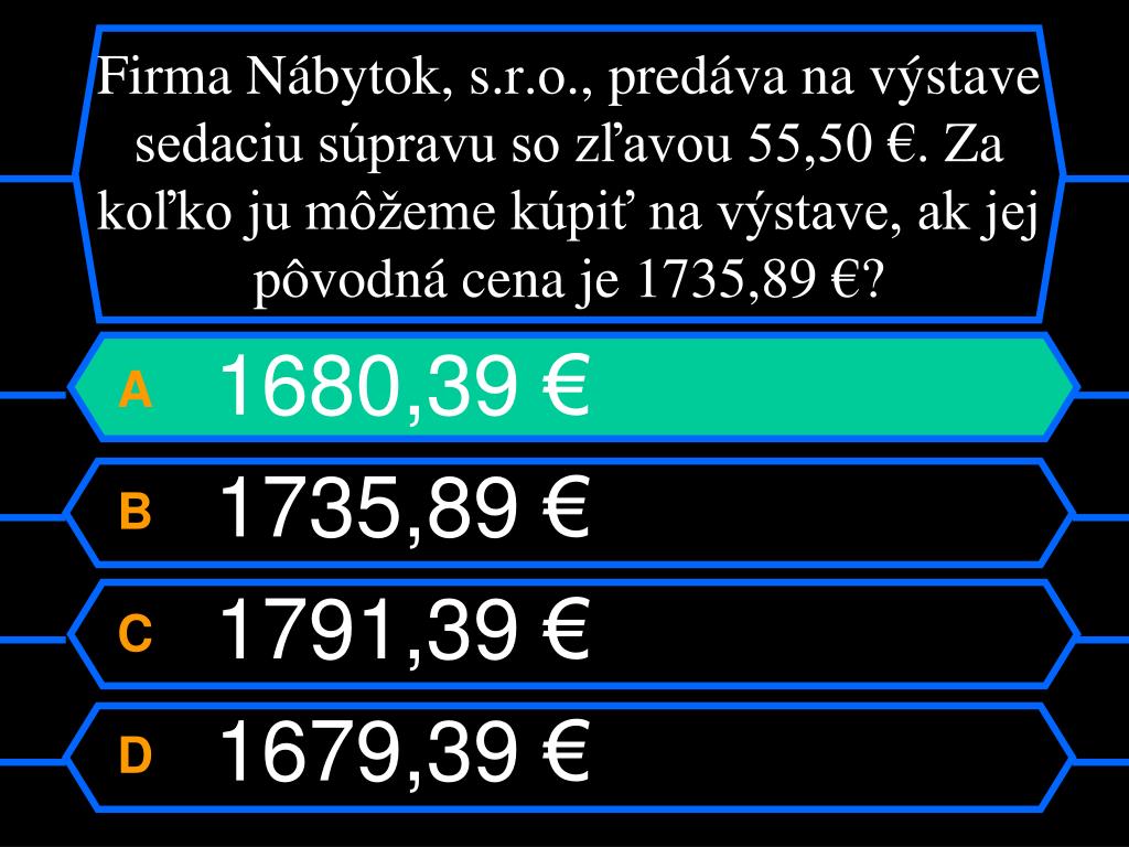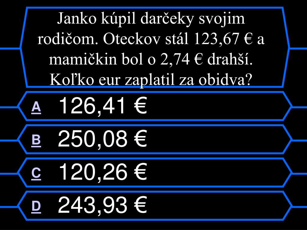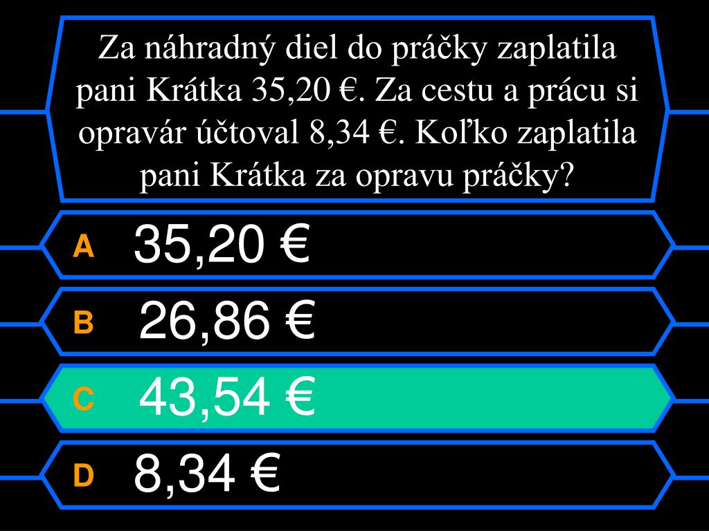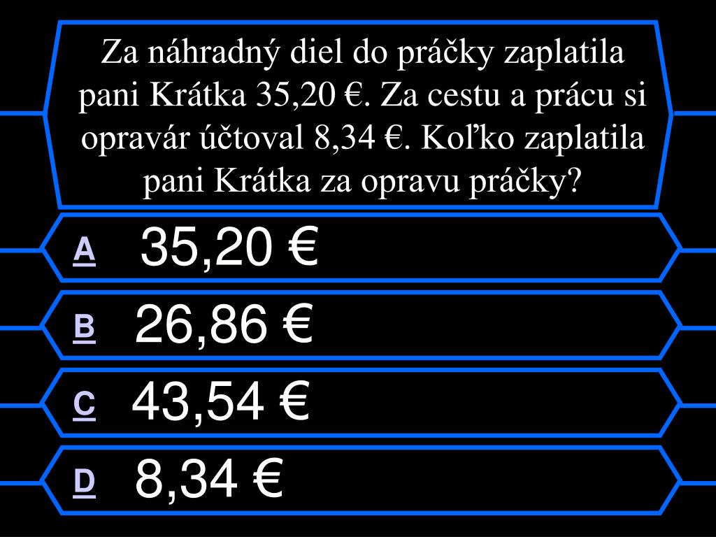 Kto bude milionárom ?. Ja, ty, on, alebo ona?. Klikaj iba na písmenka A,B,C,D. Ostatné pôjde samo. Otázka č. 1. Za náhradný diel do práčky zaplatila pani Krátka 35,20 €. Za cestu a prácu si opravár účtoval 8,34 €. Koľko zaplatila pani Krátka za opravu práčky?. A 35,20 € B 26,86 €