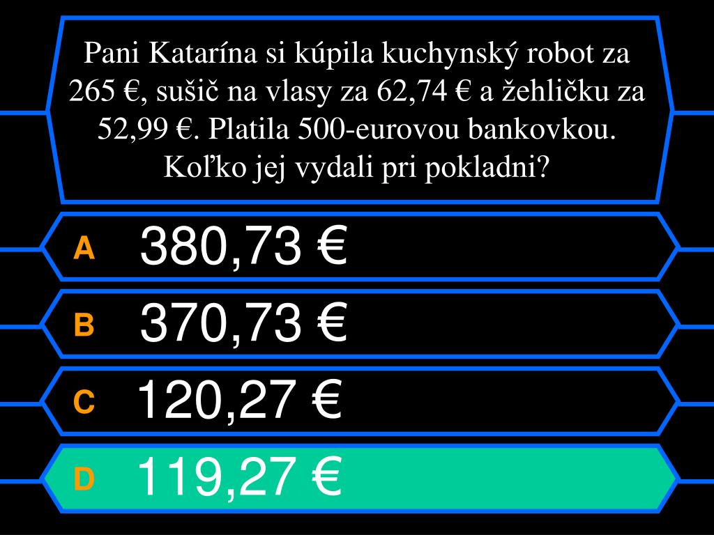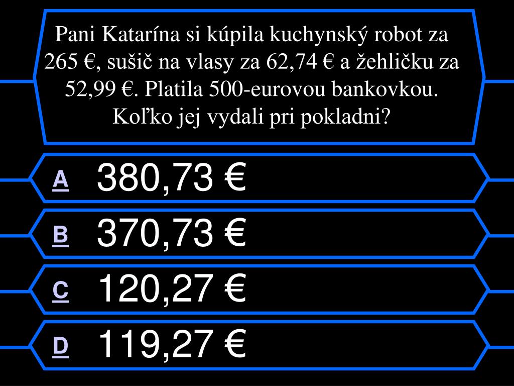 Pani Katarína si kúpila kuchynský robot za 265 €, sušič na vlasy za 62,74 € a žehličku za 52,99 €. Platila 500-eurovou bankovkou. Koľko jej vydali pri pokladni? A380,73 € B 370,73 € C 120,27 € D 119,27 €
