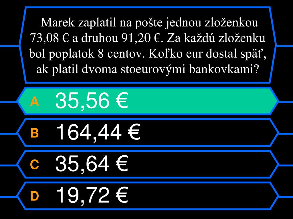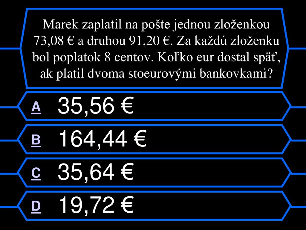 Marek zaplatil na pošte jednou zloženkou 73,08 € a druhou 91,20 €. Za každú zloženku bol poplatok 8 centov. Koľko eur dostal späť, ak platil dvoma stoeurovými bankovkami? A 35,56 € B 164,44 € C 35,64 € D 19,72 €