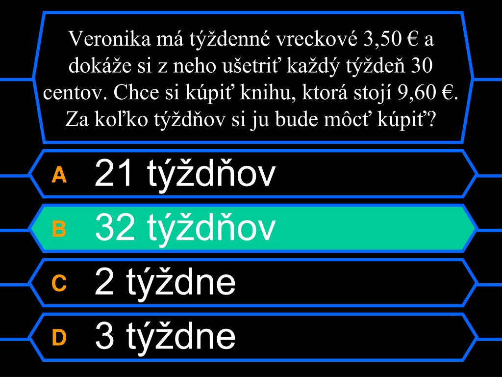 Veronika má týždenné vreckové 3,50 € a dokáže si z neho ušetriť každý týždeň 30 centov. Chce si kúpiť knihu, ktorá stojí 9,60 €. Za koľko týždňov si ju bude môcť kúpiť? A 21 týždňov B 32 týždňov C 2 týždne D 3 týždne