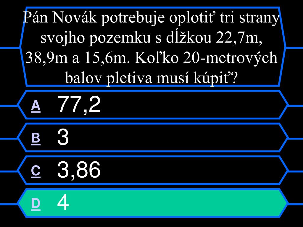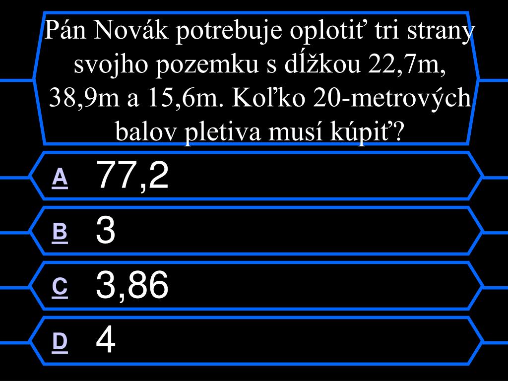 Pán Novák potrebuje oplotiť tri strany svojho pozemku s dĺžkou 22,7m, 38,9m a 15,6m. Koľko 20-metrových balov pletiva musí kúpiť? A77,2 B3 C3,86 D4