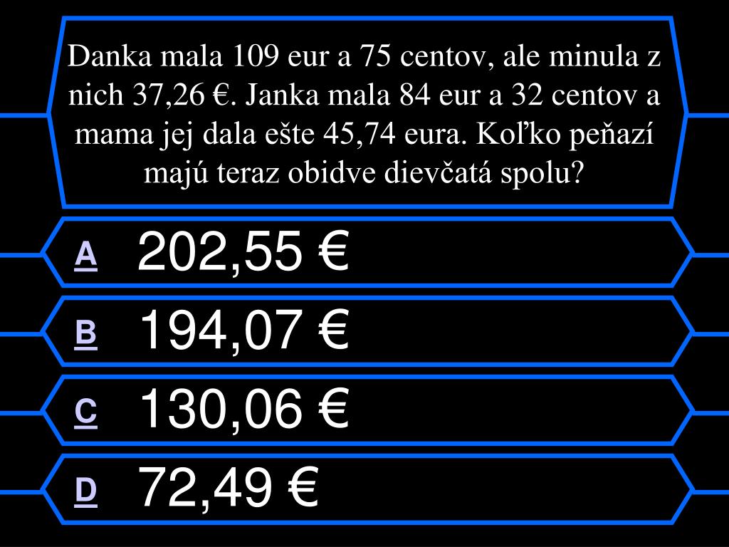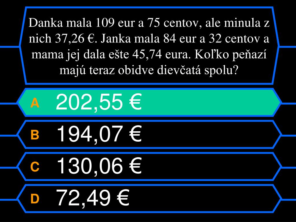 Danka mala 109 eur a 75 centov, ale minula z nich 37,26 €. Janka mala 84 eur a 32 centov a mama jej dala ešte 45,74 eura. Koľko peňazí majú teraz obidve dievčatá spolu? A 202,55 € B 194,07 € C 130,06 € D 72,49 €