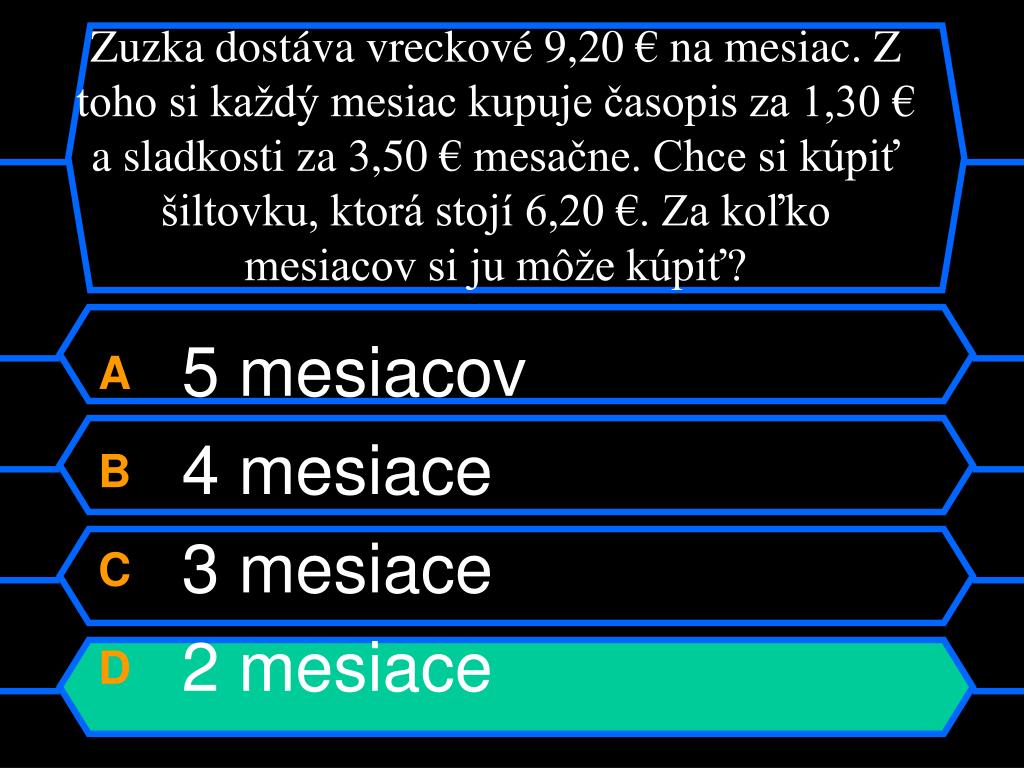 Zuzka dostáva vreckové 9,20 € na mesiac. Z toho si každý mesiac kupuje časopis za 1,30 € a sladkosti za 3,50 € mesačne. Chce si kúpiť šiltovku, ktorá stojí 6,20 €. Za koľko mesiacov si ju môže kúpiť? A5 mesiacov B4 mesiace C3 mesiace D2 mesiace