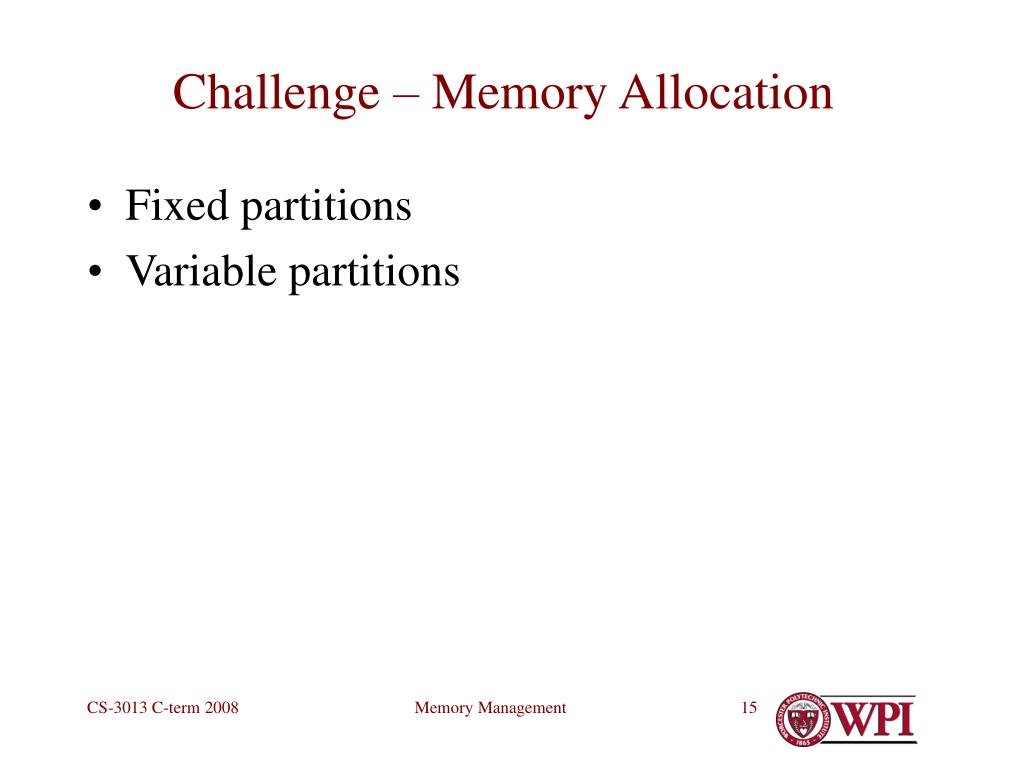 Challenge – Memory Allocation • Fixed partitions • Variable partitions Memory Management