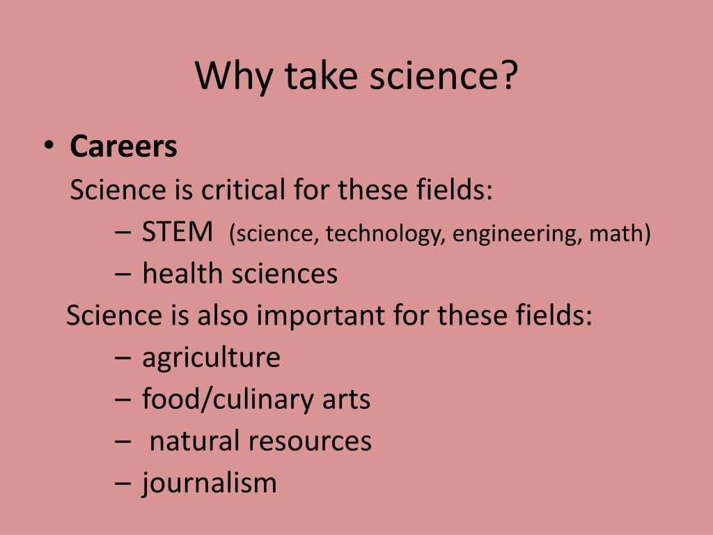 Why take science? • Careers Science is critical for these fields: • STEM (science, technology, engineering, math) • health sciences Science is also important for these fields: • agriculture • food/culinary arts • natural resources • journalism