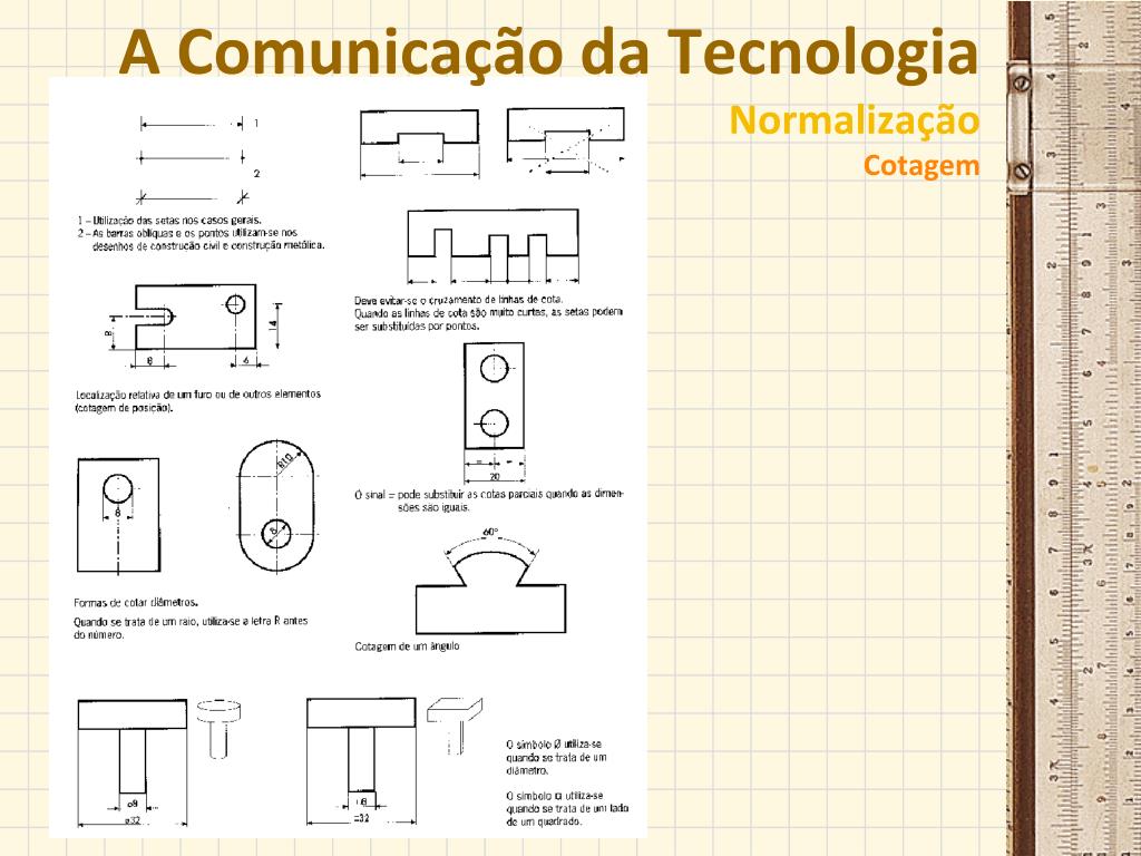 A Comunicação da TecnologiaNormalizaçãoCotagem Para que um desenho possa ser executado a partir de um desenho técnico, é necessário que este nos informe das medidas dos objectos. Designa-se por cotagem as informações inscritas no desenho e representadas por linhas, setas, símbolos e valores. Estes valores ou cotas, correspondem às dimensões reais dos objectos representados. Elementos de cotagem: • Linhas de chamada; • Linhas de cota; • Setas; • Números de cota (valor da medida); • Letras e símbolos; • Linhas de referência ou de anotações.