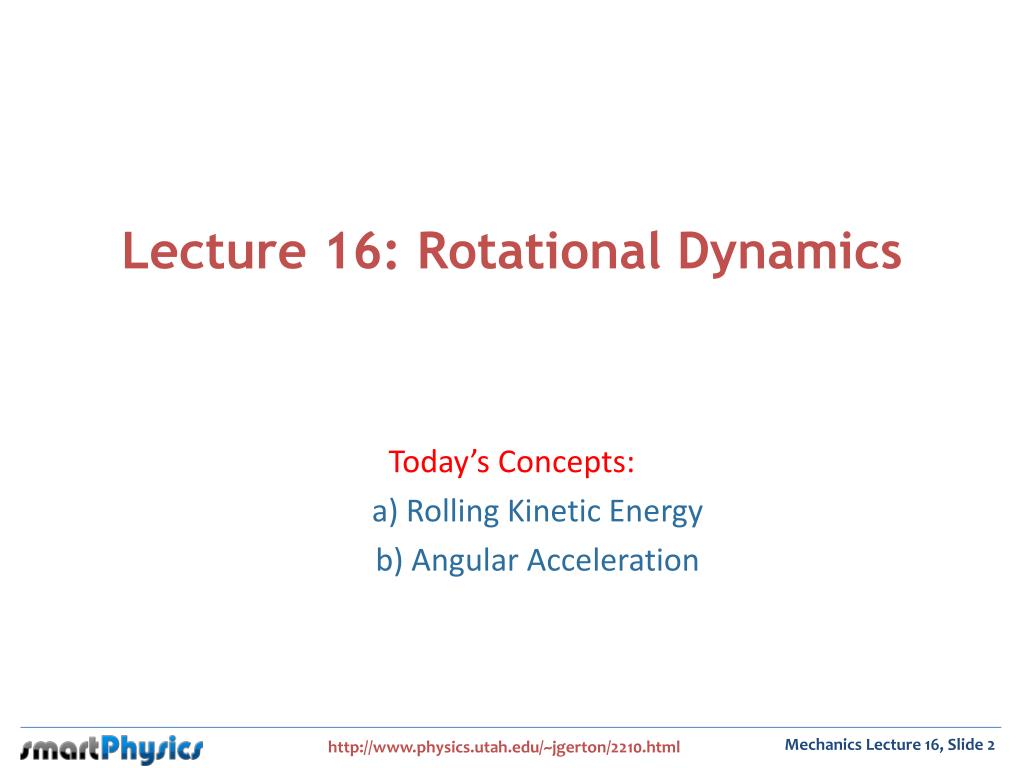 Announcements. Quiz #7 is this Friday: Unit 13: Impulse Unit 14: Rotational Kinematics You should also review energy conservation (or 1D kinematics with constant acceleration). Lecture 16: Rotational Dynamics. Today’s Concepts: a) Rolling Kinetic Energy b) Angular Acceleration.