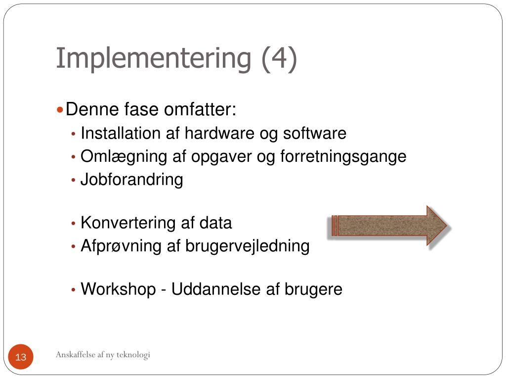 Implementering (4) • Denne fase omfatter: • Installation af hardware og software • Omlægning af opgaver og forretningsgange • Jobforandring • Konvertering af data • Afprøvning af brugervejledning • Workshop - Uddannelse af brugere Anskaffelse af ny teknologi