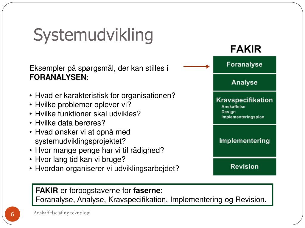 Systemudvikling • Eksempler på spørgsmål, der kan stilles i FORANALYSEN: • Hvad er karakteristisk for organisationen? • Hvilke problemer oplever vi? • Hvilke funktioner skal udvikles? • Hvilke data berøres? • Hvad ønsker vi at opnå med systemudviklingsprojektet? • Hvor mange penge har vi til rådighed? • Hvor lang tid kan vi bruge? • Hvordan organiserer vi udviklingsarbejdet? FAKIR er forbogstaverne for faserne: Foranalyse, Analyse, Kravspecifikation, Implementering og Revision. Anskaffelse af ny teknologi