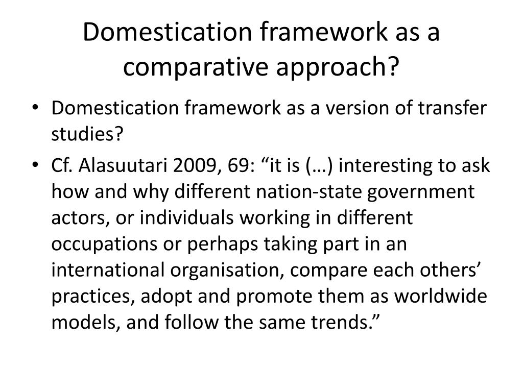 Domestication framework as a comparative approach? • Domestication framework as a version of transfer studies? • Cf. Alasuutari 2009, 69: “it is (…) interesting to ask how and why different nation-state government actors, or individuals working in different occupations or perhaps taking part in an international organisation, compare each others’ practices, adopt and promote them as worldwide models, and follow the same trends.”